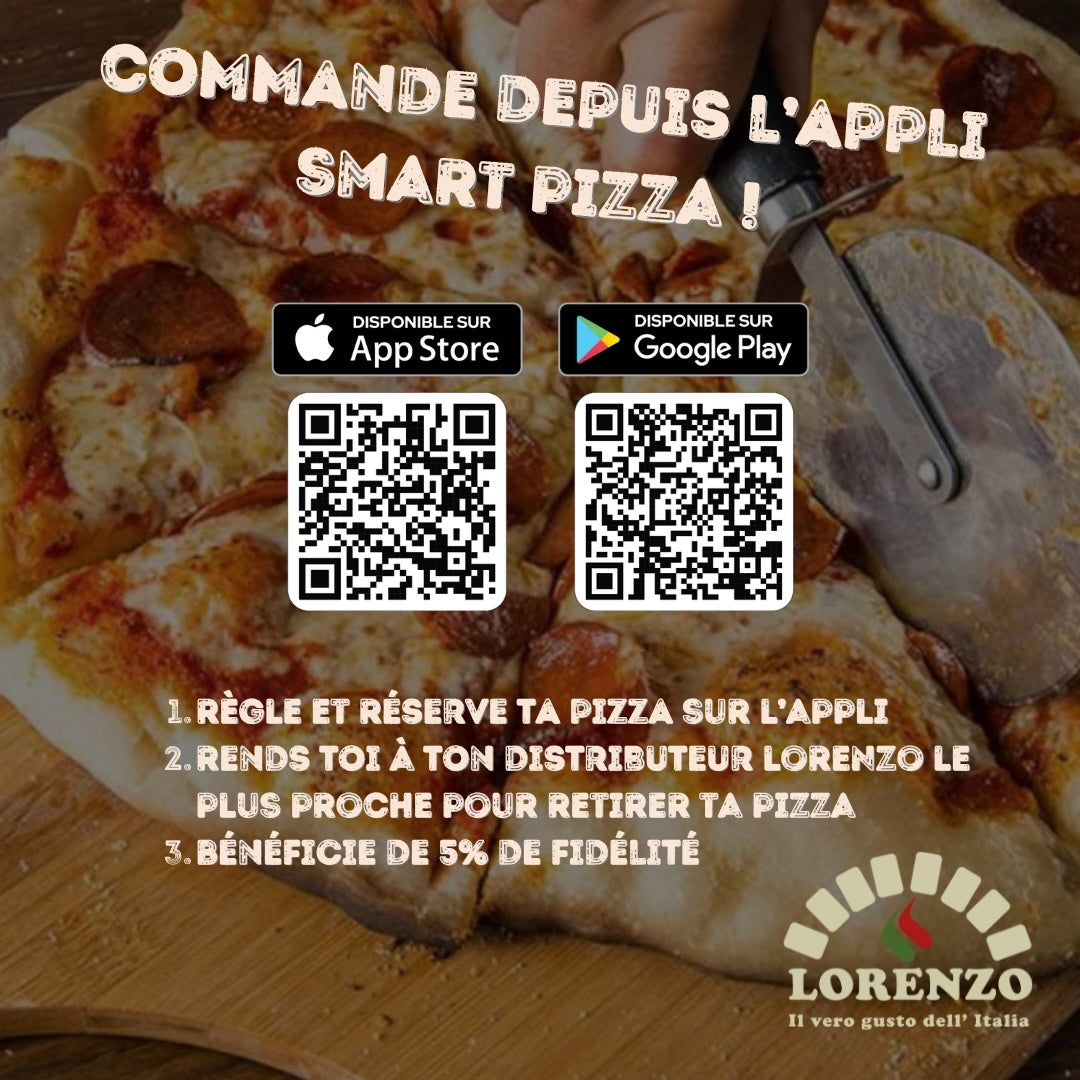 Sur Google Play ou App Store, avec "Smart Pizza", sélectionnez votre Distributeur LORENZO...Passez votre commande depuis votre canapé, et à partir du code, venez récupérer votre pizza !